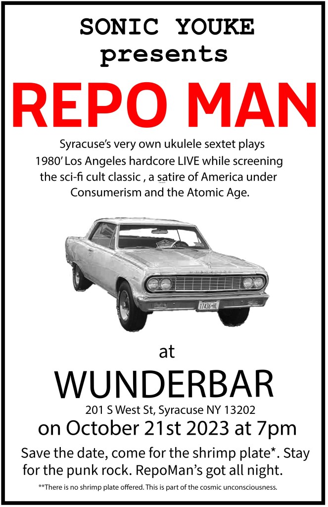 10/21/23 Wunderbar, Syracuse N.Y. 7 PM (doors open at 6pm) 201 S West St, Syracuse, NY 13202. Sonic Youke plays the hardcore movie soundtrack while screening the 80’s cult classic Repo Man with Emilio Estevez and Harry Dean Stanton.